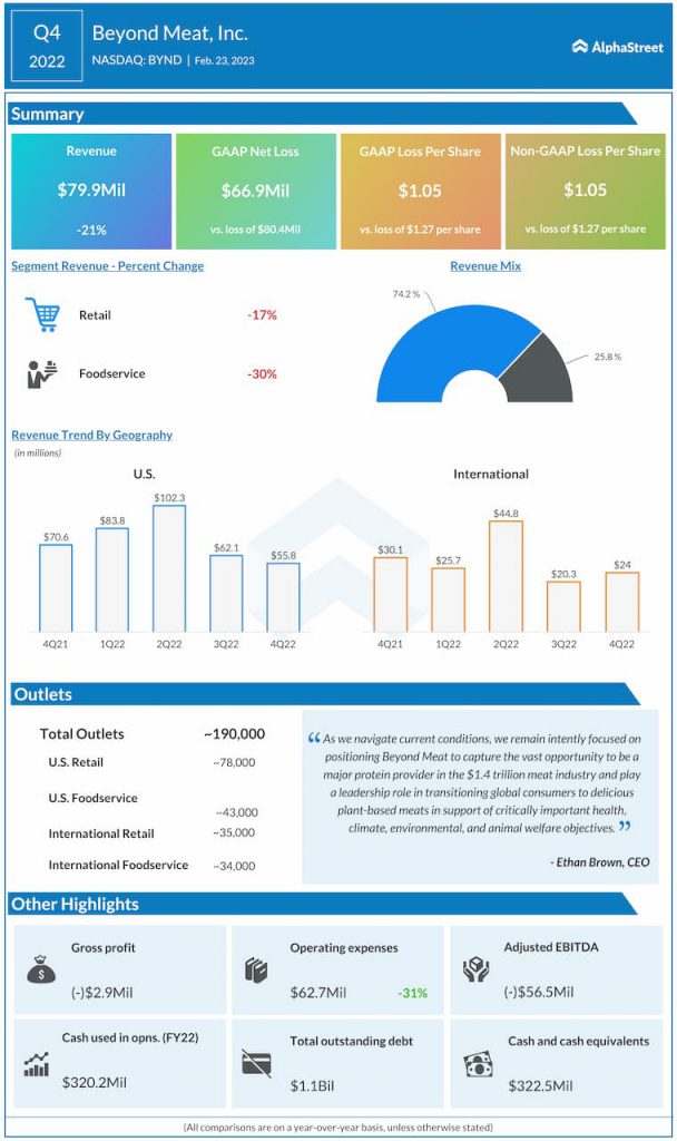 Beyond Meat reported revenue of $79.9 million for the fourth quarter of 2022, which was down nearly 21% from last year’s quarter but beat estimates of $75.8 million. Adjusted loss per share was $1.05, narrower than the $1.27 loss per share reported last year as well as the consensus estimate of a loss of $1.18 per share.