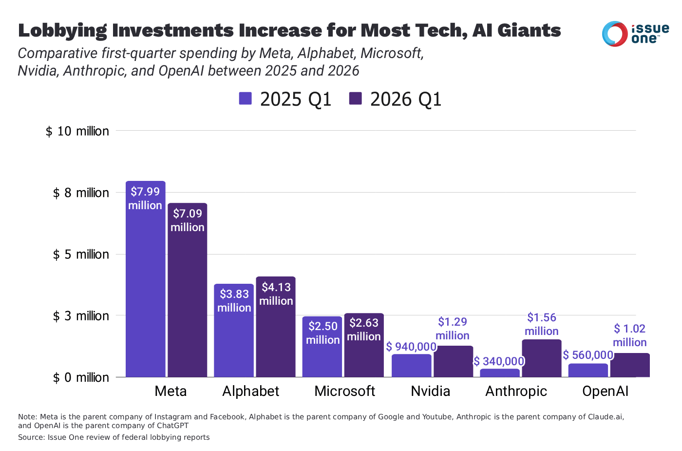Big Tech companies, and especially emerging AI giants, are now spending more than ever on lobbying in Congress. In just the first three months of 2026, 11 top tech companies, including Alphabet, Microsoft, Anthropic, and OpenAI, spent $20 million on lobbying, according to an analysis of first-quarter lobbying reports by Issue One, a bipartisan political reform group.