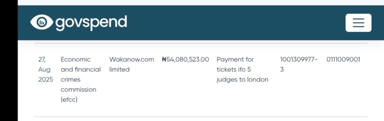 The Economic and Financial Crimes Commission (EFCC) has spent N54 million to sponsor five judges on a trip to London, United Kingdom. The payment, made on August 27, 2025, was issued to Wakanow.com Limited, according to records on the public…